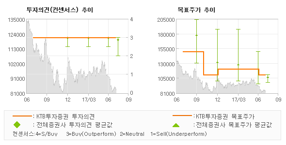 KTB투자증권의 동종목에 대한 최근 1년동안의 투자의견은 전체적으로 큰 변화없이 유지되고 있다. 목표주가는 2016년7월 150,000원까지 높아졌다가 2016년10월 110,000원을 최저점으로 목표가가 제시된 이후 최근에도 110,000원으로 제시되고 있다.