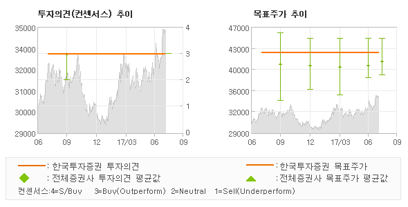 오늘 한국투자증권에서 발표된 '매수(유지)'의견 및 목표주가 42,500원은 전체 컨센서스 대비해서 대체적으로 평균치에 해당하는 수준으로, 이번 의견은 동종목에 대한 전체적인 흐름에서 크게 벗어나지 않은 것으로 파악되며 목표가평균 대비 5% 초과하고 있는 것으로 집계되었다. 참고로 최근에 목표주가를 가장 공격적으로 제시한 유안타증권에서 투자의견 '매수(유지)'에 목표주가 45,000원을 제일 보수적인 의견을 제시한 이베스트투자증권에서 투자의견 '매수(유지)'에 목표주가 38,000원을 제시한 바 있다.