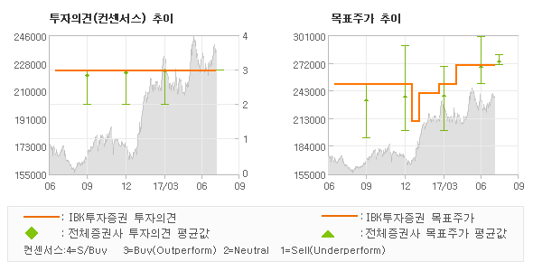 IBK투자증권의 동종목에 대한 최근 1년동안의 투자의견은 전체적으로 큰 변화없이 유지되고 있다. 목표주가는 2016년7월 210,000원이 저점으로 제시된 이후에 최근에는 270,000원까지 상향조정되고 있다.