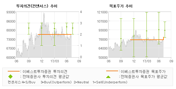 오늘 이베스트투자증권에서 발표된 'HOLD(MAINTAIN)'의견 및 목표주가 81,000원은 전체 컨센서스 대비해서 비교적 낮은 수준으로 동종목에 대한 기대감을 다소 약하게 표현한 것으로 풀이되며 목표가평균 대비 9.2%정도 미달하고 있는 것으로 집계되었다. 참고로 최근에 목표주가를 가장 공격적으로 제시한 하나금융투자에서 투자의견 '매수'에 목표주가 105,000원을 제일 보수적인 의견을 제시한 한화투자증권에서 투자의견 'HOLD(유지)'에 목표주가 75,000원을 제시한 바 있다.