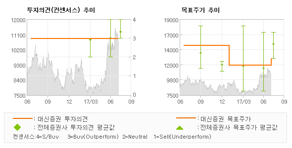 대신증권의 동종목에 대한 최근 1년동안의 투자의견은 전체적으로 큰 변화없이 유지되고 있다. 목표주가는 2016년7월 15,000원까지 높아졌다가 2017년1월 12,000원을 최저점으로 목표가가 제시된 이후 최근에 13,000원으로 새롭게 조정되고 있다.