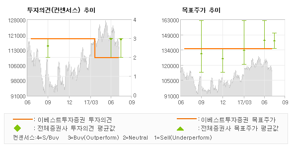 오늘 이베스트투자증권에서 발표된 'HOLD(MAINTAIN)'의견 및 목표주가 135,000원은 전체의견을 소폭 하회하는 수준으로 동종목에 대한 기대감을 다소 약하게 표현한 것으로 풀이되며 목표가평균 대비 5.3%정도 미달하고 있는 것으로 집계되었다. 참고로 최근에 목표주가를 가장 공격적으로 제시한 골든브릿지투자증권에서 투자의견 '매수(유지)'에 목표주가 150,000원을 제시한 바 있다.