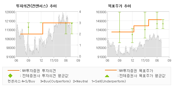 NH투자증권의 동종목에 대한 최근 1년동안의 투자의견은 전체적으로 상향조정되고 있다. 목표주가는 2016년6월 130,000원이 저점으로 제시된 이후 이번에 발표된 150,000원까지 꾸준하게 상향조정되어 왔다.