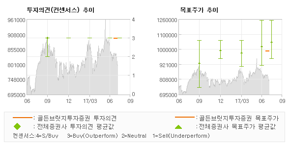 오늘 골든브릿지투자증권에서 발표된 '매수(유지)'의견 및 목표주가 1,020,000원은 전체의견에 수렴하면서 시장의 평균적인 기대감이 비교적 객관적으로 표현된 것으로 풀이되며 목표가평균 대비 5.1%정도 미달하고 있는 것으로 집계되었다. 참고로 최근에 목표주가를 가장 공격적으로 제시한 한국투자증권에서 투자의견 '매수(유지)'에 목표주가 1,250,000원을 제일 보수적인 의견을 제시한 KTB투자증권에서 투자의견 '매수'에 목표주가 960,000원을 제시한 바 있다.