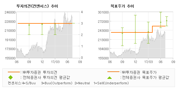 NH투자증권의 동종목에 대한 최근 1년동안의 투자의견은 전체적으로 큰 변화없이 유지되고 있다. 목표주가는 2016년7월 235,000원이 저점으로 제시된 이후 이번에 발표된 255,000원까지 꾸준하게 상향조정되어 왔다.