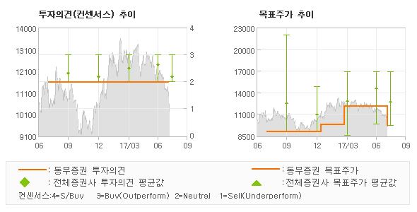 동부증권의 동종목에 대한 최근 1년동안의 투자의견은 전체적으로 큰 변화없이 유지되고 있다. 목표주가는 2016년7월 9,000원이 저점으로 제시된 이후 2017년3월 12,500원을 최고점으로 목표가가 제시되었고 최근에는 9,800원으로 다소 하향조정되고 있다.