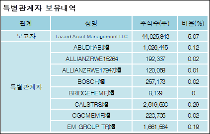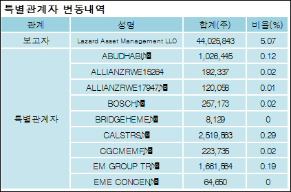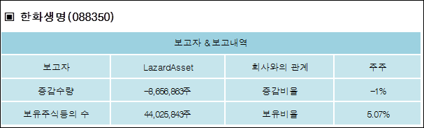 한화생명(088350)은 31일 주주 LazardAsset를 비롯한 특별관계자의 보유주식이 감소되었다고 발표했다. 이는 직전 보고일보다 8,656,863주 감소하여 지분율은 5.07%로 하락했다. 이번 보고 사유는 장내매수및매도등으로 알려졌다.