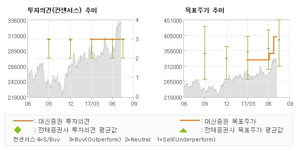 대신증권의 동종목에 대한 최근 3개월 동안의 투자의견은 전체적으로 큰 변화없이 유지되고 있다. 목표주가는 2017년3월 330,000원이 저점으로 제시된 이후 이번에 발표된 400,000원까지 꾸준하게 상향조정되어 왔다.
