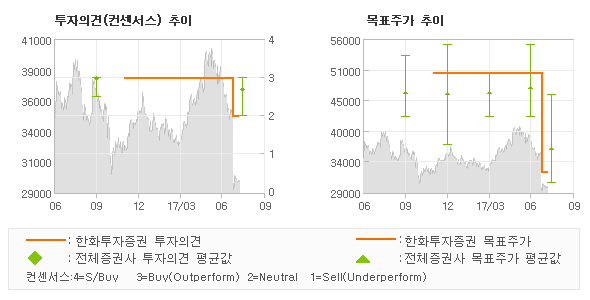 한화투자증권의 동종목에 대한 최근 6개월 동안의 투자의견은 전체적으로 조금 하향조정되고 있다. 목표주가는 2016년11월 50,000원까지 높아졌다가 2017년7월 32,000원을 최저점으로 목표가가 제시된 이후 최근에도 32,000원으로 제시되고 있다.