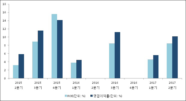 이번분기 기준으로 추정되는 안랩의 자기자본이익률(ROE)은 4.6%로 나타났다. 이는 최근 일년과 비교했을 때 급등한 수치이다. 전년 동기인 2016년 2분기 ROE는 3.8%로 이번 분기에 0.8%p 상승했다. 한편 동종목의영업이익률은 5.6%이다. 이는 최근 일년과 비교했을 때 급등하였다. 2분기 매출액, 영업이익 모두 상승했는데, 영업이익의 상승폭이 더 컸기 때문에 영업이익률이 상승했다. 지난해 동기 영업이익률은 4.5%로 이번 2분기가 1.1%p 상승했다.