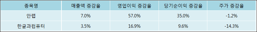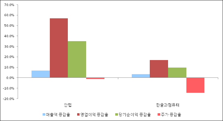 다음은 안랩과 동일 업종 내 비교 그룹 종목의 각각 최근 실적의 전년 동기 대비 성장률이다. 안랩의 매출액 증감율은 타 종목 대비 가장 우수한 편이다. 그리고 주가는 하락하였지만 하락율이 비교적 크지는 않았다.