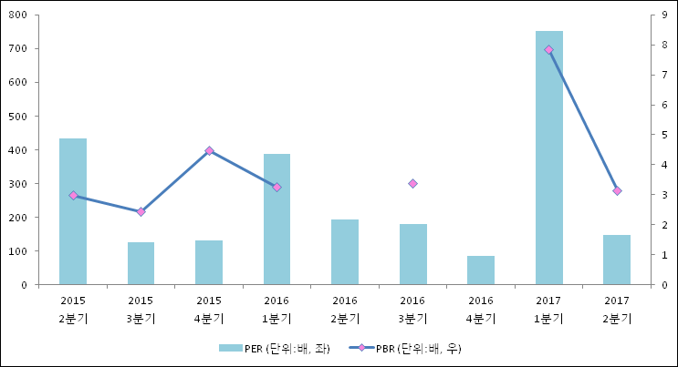 주가가 1주당 수익의 몇배가 되는지 나타내는 주가수익비율(PER)은 148.24배로 나타났다. 전년 동기 PER은 193.89배로 이번 분기에 하락했다.주가가 1주당 순자산의 몇배인지 알려주는 주가순자산비율인 PBR은 7.83배이다. 최근 1년 대비 이번 분기 PBR은 급등했다. 2분기 주당순자산(BPS), 주가 모두 상승했는데, 주가의 상승폭이 더 컸기 때문에 PBR이 상승했다. 지난해 동기 PBR은 3.25배로 이번 2분기 PBR이 상승했다.