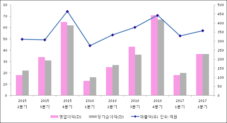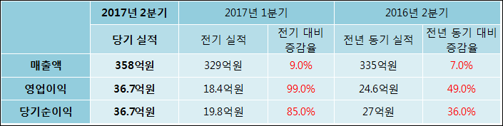 08월 03일 안랩(053800)의 2017년 2분기 연결 잠정 실적이 발표됐다. 지난해 같은 기간 대비해서 매출액, 영업이익, 당기순이익 모두 증가하였다. 335억원이었던 매출액은 7% 증가하여 358억원을 기록했다. 영업이익은 49% 상승하여 36.7억원이고, 당기순이익은 36.7억원으로 발표됐다.