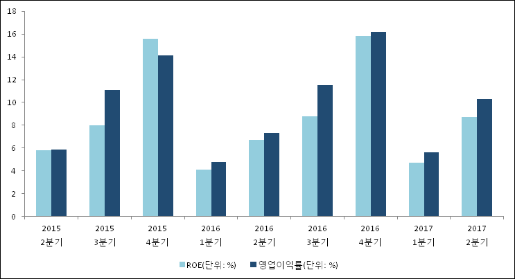 이번분기 기준으로 추정되는 안랩의 자기자본이익률(ROE)은 8.7%로 나타났다. 전년 동기인 2016년 2분기 ROE는 6.7%로 이번 분기에 2%p 상승했다. 한편 동종목의영업이익률은 10.3%이다. 지난해 동기 영업이익률은 7.3%로 이번 2분기가 3%p 상승했다.