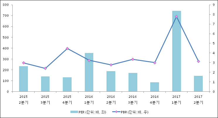 주가가 1주당 수익의 몇배가 되는지 나타내는 주가수익비율(PER)은 144.07배로 나타났다. 전년 동기 PER은 188.15배로 이번 분기에 하락했다.주가가 1주당 순자산의 몇배인지 알려주는 주가순자산비율인 PBR은 3.14배이다. 지난해 동기 PBR은 2.78배로 이번 2분기 PBR이 상승했다.