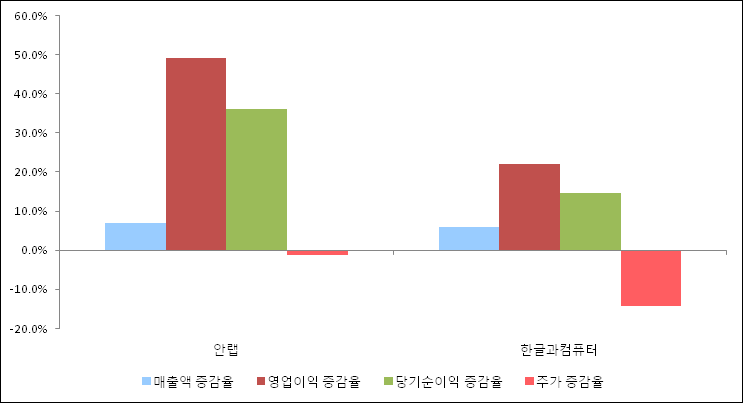 다음은 안랩과 동일 업종 내 비교 그룹 종목의 각각 최근 실적의 전년 동기 대비 성장률이다. 안랩의 매출액 증감율은 타 종목 대비 가장 우수한 편이다. 그리고 주가는 하락하였지만 하락율이 비교적 크지는 않았다.