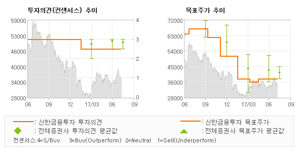 신한금융투자의 동종목에 대한 최근 1년동안의 투자의견은 전체적으로 조금 하향조정되고 있다. 목표주가는 2016년7월 67,000원까지 높아졌다가 2017년4월 36,000원을 최저점으로 목표가가 제시된 이후 최근에 38,000원으로 새롭게 조정되고 있다.