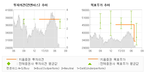 키움증권의 동종목에 대한 최근 6개월 동안의 투자의견은 전체적으로 큰 변화없이 유지되고 있다. 목표주가는 2017년2월 45,000원까지 높아졌다가 2017년7월 33,000원을 최저점으로 목표가가 제시된 이후 최근에도 33,000원으로 제시되고 있다.