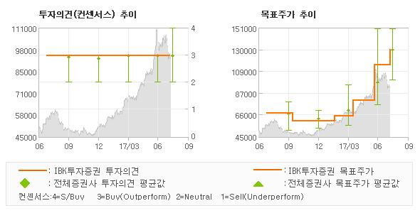 오늘 IBK투자증권에서 발표된 '매수(유지)'의견 및 목표주가 130,000원은 전체의견에 수렴하면서 시장의 평균적인 기대감이 비교적 객관적으로 표현된 것으로 풀이되며 목표가평균과 대비해서 미미한 차이가 나는 것으로 집계되었다. 참고로 최근에 목표주가를 가장 공격적으로 제시한 유안타증권에서 투자의견 '매수(유지)'에 목표주가 150,000원을 제일 보수적인 의견을 제시한 하이투자증권에서 투자의견 '매수(유지)'에 목표주가 100,000원을 제시한 바 있다.