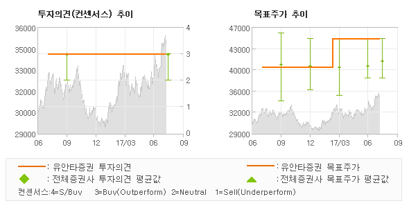 유안타증권의 동종목에 대한 최근 1년동안의 투자의견은 전체적으로 큰 변화없이 유지되고 있다. 목표주가는 2016년8월 40,000원이 저점으로 제시된 이후 이번에 발표된 45,000원까지 꾸준하게 상향조정되어 왔다.