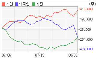 | 외국인과 기관은 순매도, 개인은 순매수(한달누적) 7월31일부터 전일까지 기관이 3거래일 연속 순매수했다. 4주간을 기준으로 보면 외국인이 순매도로 돌아서면서 186,518주를 순매도했고, 기관도 매도 우위를 보이면서 201,526주를 순매도했지만, 개인은 오히려 순매수량을 늘리며 388,044주를 순매수했다. |