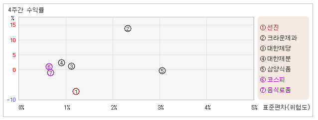 | 선진 | 대한제당 | 크라운제과 | 삼양식품 | 대한제분 | |