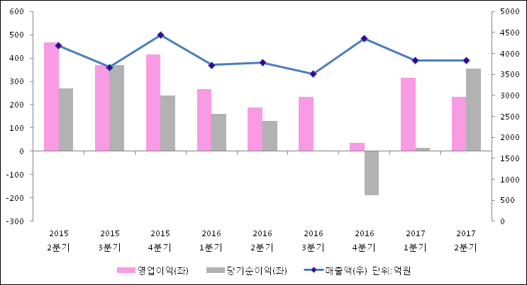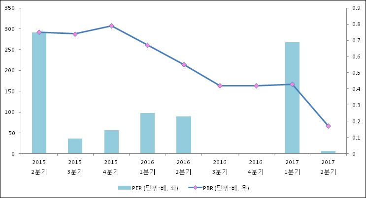 주가가 1주당 수익의 몇배가 되는지 나타내는 주가수익비율(PER)은 7.3배로 나타났다. 전년 동기 PER은 89.22배로 이번 분기에 하락했다.주가가 1주당 순자산의 몇배인지 알려주는 주가순자산비율인 PBR은 0.17배이다.최근 1년 대비 이번 분기 PBR은 급락했다. 지난해 동기 PBR은 0.55배로 이번 2분기 PBR이 하락했다.