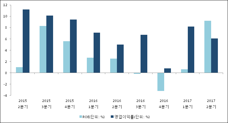 이번분기 기준으로 추정되는 S&T홀딩스의 자기자본이익률(ROE)은 9.2%로 나타났다. 이는 최근 일년과 비교했을 때 급등한 수치이다. 2분기 자기자본은 상승하였으나 당기순이익 상승폭이 더 컸기 때문이다. 전년 동기인 2016년 2분기 ROE는 2.5%로 이번 분기에 6.7%p 상승했다. 한편 동종목의영업이익률은 6.1%이다. 지난해 동기 영업이익률은 5%로 이번 2분기가 1.1%p 상승했다.