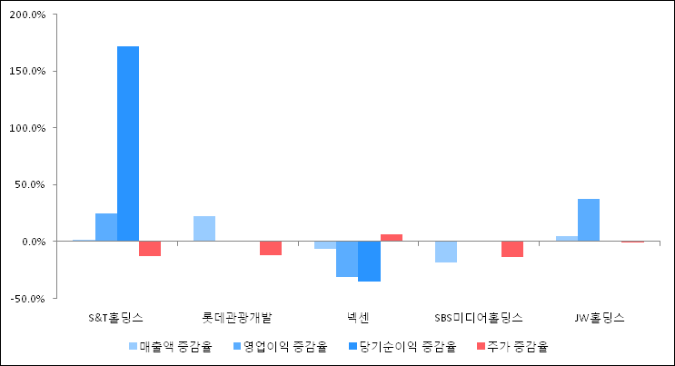 다음은 S&T홀딩스와 동일 업종 내 비교 그룹 종목의 각각 최근 실적의 전년 동기 대비 성장률이다. S&T홀딩스의 매출액 증감율은 타 종목 대비 양호한 편이다. 그리고 주가의 하락율이 비교적 큰 편으로 나타났다.