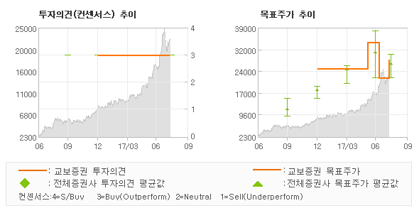 교보증권의 동종목에 대한 최근 6개월 동안의 투자의견은 전체적으로 큰 변화없이 유지되고 있다. 목표주가는 2017년7월 22,000원까지 내려갔다가 2017년6월 34,000원을 최고점으로 목표가가 제시된 이후 최근에 28,000원으로 한단계 하향조정되고 있다.