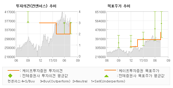 오늘 케이프투자증권에서 발표된 '매수(상향)'의견 및 목표주가 450,000원은 전체 컨센서스 대비해서 대체적으로 평균치에 해당하는 수준으로, 이번 의견은 동종목에 대한 전체적인 흐름에서 크게 벗어나지 않은 것으로 파악되며 목표가평균 대비 15.2%정도 미달하고 있는 것으로 집계되었다. 참고로 최근에 목표주가를 가장 공격적으로 제시한 유화증권에서 투자의견 '매수'에 목표주가 650,000원을 제일 보수적인 의견을 제시한 유안타증권에서 투자의견 'HOLD(M)'에 목표주가 400,000원을 제시한 바 있다.