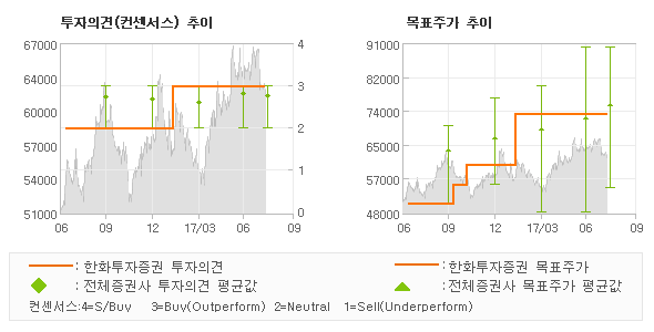 오늘 한화투자증권에서 발표된 '매수(유지)'의견 및 목표주가 73,000원은 전체 컨센서스 대비해서 대체적으로 평균치에 해당하는 수준으로, 이번 의견은 동종목에 대한 전체적인 흐름에서 크게 벗어나지 않은 것으로 파악되며 목표가평균 대비 2.8%정도 미달하고 있는 것으로 집계되었다. 참고로 최근에 목표주가를 가장 공격적으로 제시한 한국투자증권에서 투자의견 '매수(유지)'에 목표주가 90,000원을 제일 보수적인 의견을 제시한 메리츠종금증권에서 투자의견 'HOLD'에 목표주가 54,000원을 제시한 바 있다.