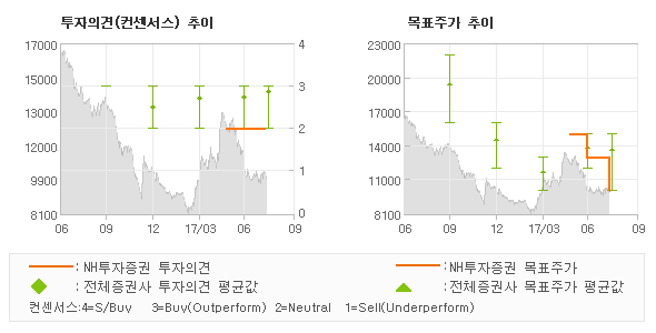 NH투자증권의 동종목에 대한 최근 3개월 동안의 투자의견은 전체적으로 큰 변화없이 유지되고 있다. 목표주가는 2017년5월 15,000원까지 높아졌다가 2017년6월 13,000원을 최저점으로 목표가가 제시된 이후 최근에 10,000원으로 새롭게 조정되고 있다.