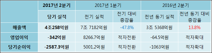 08월 09일 한국가스공사(036460)의 2017년 2분기 연결 잠정 실적이 발표됐다. 매출액은 작년 같은 기간 대비해서 13.83% 증가하여 4조258억원을 달성했다. 영업이익은 -342억원으로 -64.5억원에서 적자폭이 확대되었다. 당기순이익은 -1063억원에서-2587.3억원으로 적자확대되었다고 발표했다.