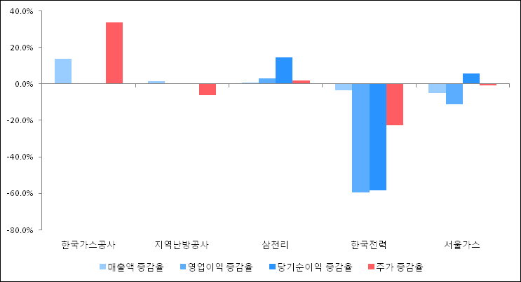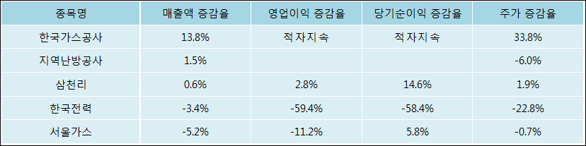 다음은 한국가스공사와 동일 업종 내 비교 그룹 종목의 각각 최근 실적의 전년 동기 대비 성장률이다. 한국가스공사의 매출액 증감율은 타 종목 대비 가장 우수한 편이다. 그리고 주가는 가장 높은 상승률을 보였다.