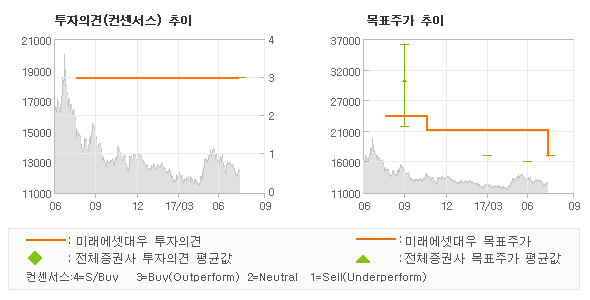 미래에셋대우의 동종목에 대한 최근 1년동안의 투자의견은 전체적으로 큰 변화없이 유지되고 있다. 목표주가는 2016년8월 24,000원까지 높아졌다가 2016년11월 21,500원을 최저점으로 목표가가 제시된 이후 최근에 17,000원으로 새롭게 조정되고 있다.