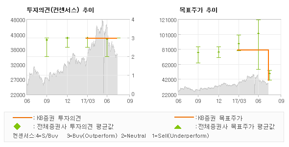 오늘 KB증권에서 발표된 '매수(유지)'의견 및 목표주가 40,000원은 전체 컨센서스 대비해서 대체적으로 평균치에 해당하는 수준으로, 이번 의견은 동종목에 대한 전체적인 흐름에서 크게 벗어나지 않은 것으로 파악되며 목표가평균 대비 46%정도 미달하고 있는 것으로 집계되었다. 참고로 최근에 목표주가를 가장 공격적으로 제시한 NH투자증권에서 투자의견 '매수'에 목표주가 120,000원을 제시한 바 있다.