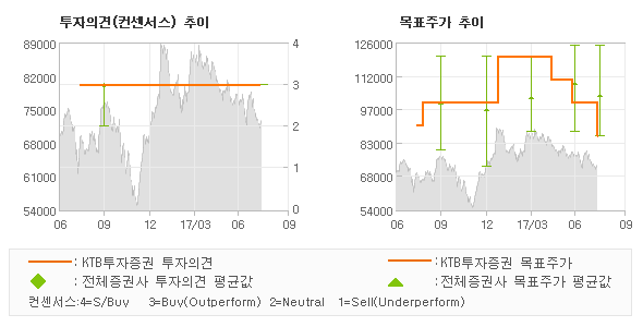 KTB투자증권의 동종목에 대한 최근 1년동안의 투자의견은 전체적으로 큰 변화없이 유지되고 있다. 목표주가는 120,000원이 고점으로, 반대로 90,000원이 저점으로 제시된 이후 이번에 85,000수준으로 새롭게 조정되고 있다.