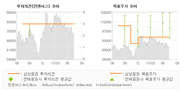삼성증권의 동종목에 대한 최근 1년동안의 투자의견은 전체적으로 큰 변화없이 유지되고 있다. 목표주가는 2016년8월 105,000원까지 높아졌다가 2016년11월 77,000원을 최저점으로 목표가가 제시된 이후 최근에 87,000원으로 새롭게 조정되고 있다.