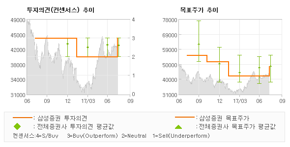 삼성증권의 동종목에 대한 최근 1년동안의 투자의견은 전체적으로 큰 변화없이 유지되고 있다. 목표주가는 2016년8월 55,000원까지 높아졌다가 2017년2월 42,000원을 최저점으로 목표가가 제시된 이후 최근에 48,000원으로 새롭게 조정되고 있다.