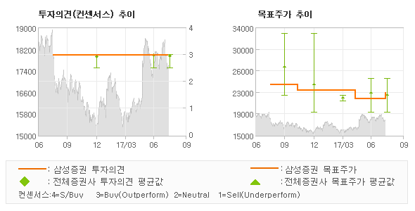 삼성증권의 동종목에 대한 최근 1년동안의 투자의견은 전체적으로 큰 변화없이 유지되고 있다. 목표주가는 2016년8월 24,000원까지 높아졌다가 2017년5월 21,500원을 최저점으로 목표가가 제시된 이후 최근에 22,500원으로 새롭게 조정되고 있다.