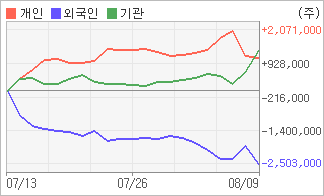 | 기관/개인 순매수, 외국인은 순매도(한달누적) 8월8일부터 전일까지 기관이 2거래일 연속 순매수했다. 4주간을 기준으로 보면 기관이 방향성있는 매매를 하면서 1,364,591주를 순매수했고, 개인들도 매기를 떨어뜨리면서도 1,137,976주를 순매수했다. 반면 그 동안 외국인은 매도 우위를 지속하면서 2,502,567주를 순매도했다. |
