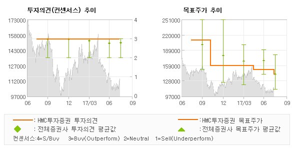 HMC투자증권의 동종목에 대한 최근 1년동안의 투자의견은 전체적으로 큰 변화없이 유지되고 있다. 목표주가는 2016년8월 210,000원까지 높아졌다가 2017년5월 150,000원을 최저점으로 목표가가 제시된 이후 최근에 140,000원으로 새롭게 조정되고 있다.