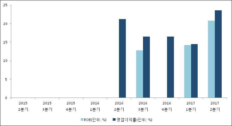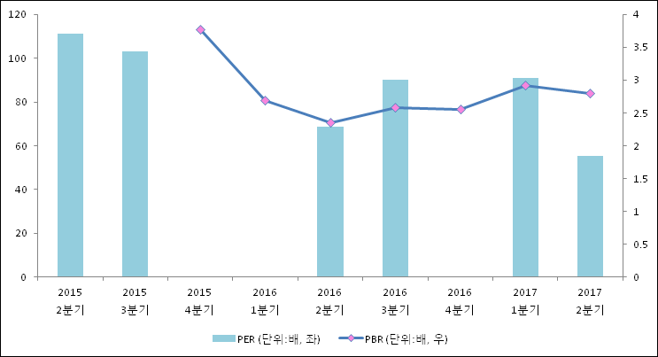 주가가 1주당 수익의 몇배가 되는지 나타내는 주가수익비율(PER)은 55.41배로 나타났다. 전년 동기 PER은 68.58배로 이번 분기에 하락했다.주가가 1주당 순자산의 몇배인지 알려주는 주가순자산비율인 PBR은 2.8배이다. PBR은 최근 1년동안 큰 변동 없이 비슷한 수치를 보이고 있다. 지난해 동기 PBR은 2.35배로 이번 2분기 PBR이 상승했다.