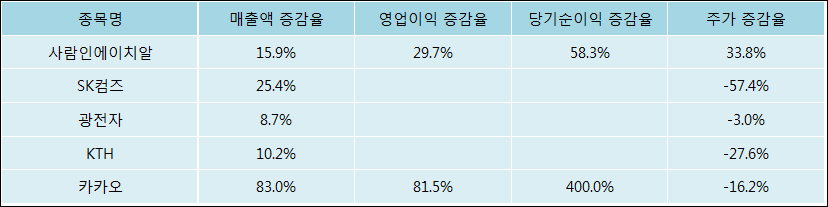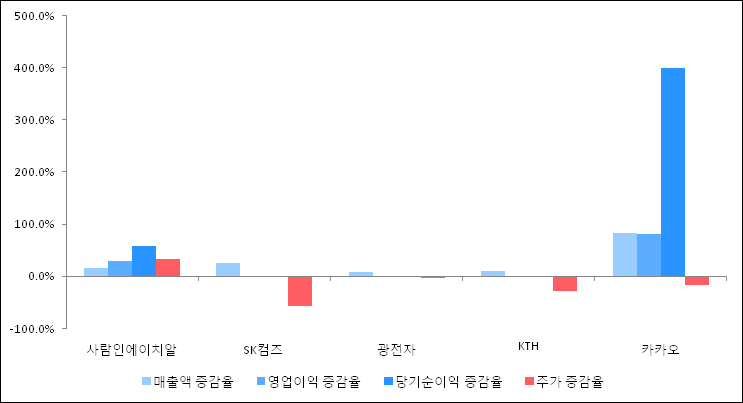 다음은 사람인에이치알과 동일 업종 내 비교 그룹 종목의 각각 최근 실적의 전년 동기 대비 성장률이다. 사람인에이치알의 매출액 증감율은 타 종목 대비 양호한 편이다. 그리고 주가는 가장 높은 상승률을 보였다.