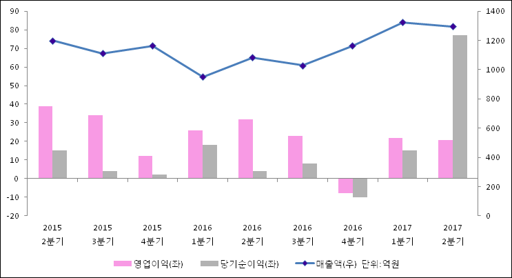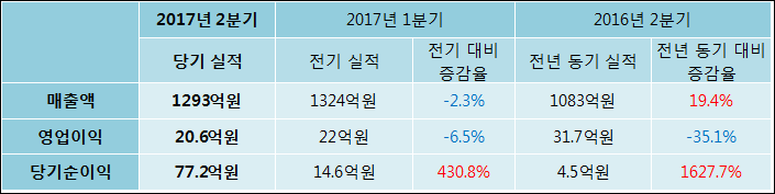 08월 10일 대원전선(006340)의 2017년 2분기 연결 확정 실적이 발표됐다. 매출액은 지난해 같은 기간 대비 19.37% 개선되어 1293억원을 기록하였고, 당기순이익 역시 1627.74% 상승하여 77.2억원으로 발표되었다. 이와는 대조되게 영업이익은20.6억원으로 35.08% 감소하였다.