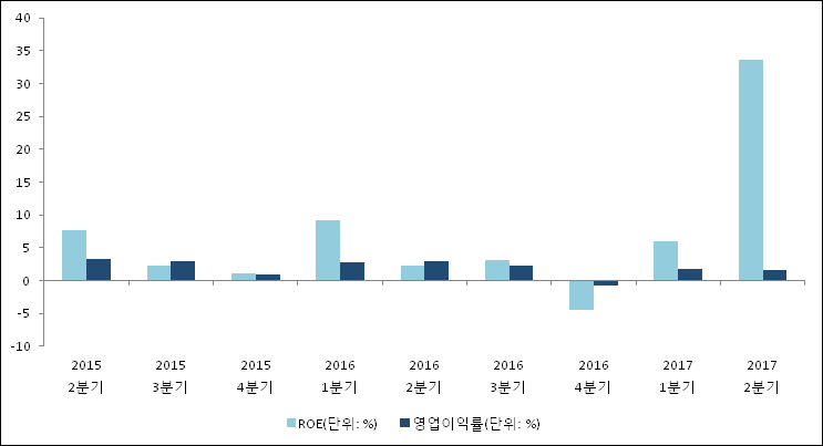 이번분기 기준으로 추정되는 대원전선의 자기자본이익률(ROE)은 33.6%로 나타났다. 이는 최근 일년과 비교했을 때 급등한 수치이다. 2분기 자기자본은 상승하였으나 당기순이익 상승폭이 더 컸기 때문이다. 전년 동기인 2016년 2분기 ROE는 2.2%로 이번 분기에 31.4%p 상승했다. 한편 동종목의영업이익률은 1.6%이다. 지난해 동기 영업이익률은 2.9%로 이번 2분기에 1.3%p 하락했다.