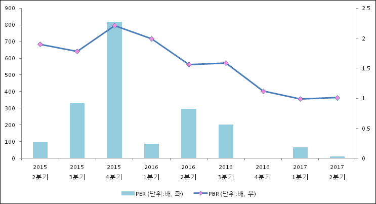 주가가 1주당 수익의 몇배가 되는지 나타내는 주가수익비율(PER)은 12.57배로 나타났다. 전년 동기 PER은 297.5배로 이번 분기에 하락했다.주가가 1주당 순자산의 몇배인지 알려주는 주가순자산비율인 PBR은 1.01배이다. 지난해 동기 PBR은 1.56배로 이번 2분기 PBR이 하락했다.