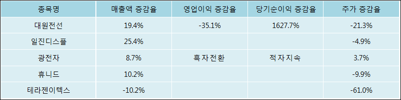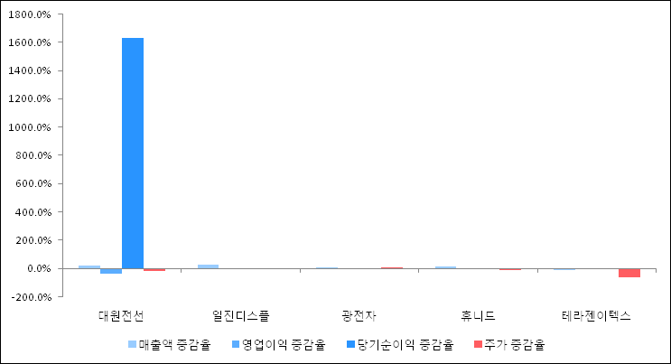 다음은 대원전선과 동일 업종 내 비교 그룹 종목의 각각 최근 실적의 전년 동기 대비 성장률이다. 대원전선의 매출액 증감율은 타 종목 대비 우수한 편이다. 그리고 주가의 하락율이 비교적 큰 편으로 나타났다.