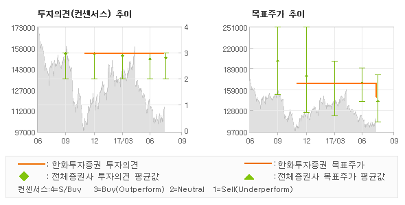 오늘 한화투자증권에서 발표된 '매수(유지)'의견 및 목표주가 147,000원은 전체의견에 수렴하면서 시장의 평균적인 기대감이 비교적 객관적으로 표현된 것으로 풀이되며 목표가평균 대비 5.8% 초과하고 있는 것으로 집계되었다. 참고로 최근에 목표주가를 가장 공격적으로 제시한 미래에셋대우에서 투자의견 '매수(상향)'에 목표주가 180,000원을 제일 보수적인 의견을 제시한 신한금융투자에서 투자의견 '매수'에 목표주가 110,000원을 제시한 바 있다.